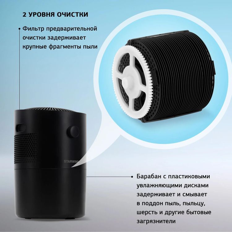 - Барабан с пластиковыми увлажняющими дисками задерживает и смывает в поддон пыль, пыльцу, мелкую грязь, и другие бытовые загрязнители;